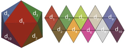 As 20 projeções triangulares são unidas duas a duas para formar as faces losangulares (diamonds), garantindo a distribuição uniforme células quadriláteras. Ver no Manual DGGRID a implementação: